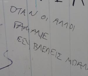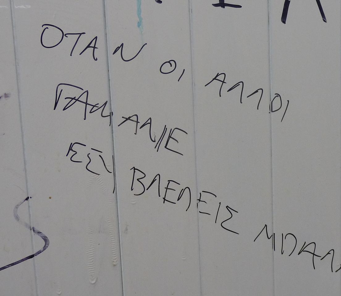 Κάποτε δεν ξέρω αν αντιπαθώ κάτι ή αν απλώς με κάνει και πλήττω, οπότε απλώς του την έχω φυλαγμένη. Για παράδειγμα, το ποδόσφαιρο. Πλήξη. Σε μια τουαλέτα στο Αντίρριο, βρήκα ένα σλόγκαν για να ντύσω την απύθμενη βαρεμάρα που μου προκαλεί η μπάλα. Εκλογές έρχονται, οι υπερβολές και τα συνθήματα ευδοκιμούν: