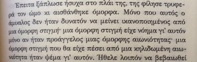 Βαθιά μέσα από τον βυθό του εφηβικού ιδεαλισμού ο κόσμος από πάνω φαντάζει είτε ένα απέραντο φωτεινό γαλάζιο με ανεξήγητους λαμπυρισμούς εδώ κι εκεί, είτε γαλήνιο πυκνό τοπίο: η ίδια η θάλασσα που είσαι μέσα της καταβυθισμένος. Ό,τι κι αν σου δείξουνε τα βιβλία, εκεί πριν τα είκοσι, εσύ είσαι ακόμα βατραχάνθρωπος κι αιωρείσαι: για να κοιτάξεις έξω πρέπει να κοιτάξεις πάνω, αλλά και πάλι ένα απέραντο φωτεινό γαλάζιο με ανεξήγητους λαμπυρισμούς εδώ κι εκεί βλέπεις.
