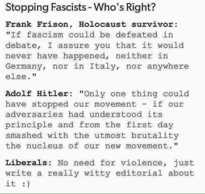 Ως εδώ μια χαρά. Προχωράμε στο ζουμί: ο φασισμός και του 20ου και του 21ου αιώνα έχουν αναγνωριστεί ως χρήσιμοι αντιπερισπασμοί ή και αντίπαλα δέη, πάλιν και πολλάκις. Επίσης, έχουν αναγνωριστεί ως ο θάνατος της κοινωνίας και ως αφανισμός ανθρώπων. Όσοι δεν τον πολεμάνε τον φασισμό κι όσοι θέλουνε να ανοίξουνε διάλογο μαζί του προφανώς δεν αναγνωρίζουν τη χρήση του (να καθυποτάξει και να αφανίσει) και τις πασίγνωστες μεθόδους του. Οξυδερκείς αναλύσεις υπάρχουνε βεβαίως, το ζήτημα είναι κατά πόσον θέλουμε να τις αγνοούμε. Τέλος, κανονικοποίηση του φασισμού, ισαπεχισμοί και συμμετρίες ακόμα και ο υβριστικός για τη δεξιά ευφημισμός «άκρα δεξιά», παραγνωρίζουν το ότι δεν μπορεί να δίνεται βήμα στους φασίστες και, εν γένει, στους εχθρούς της ελευθερίας (του λόγου).